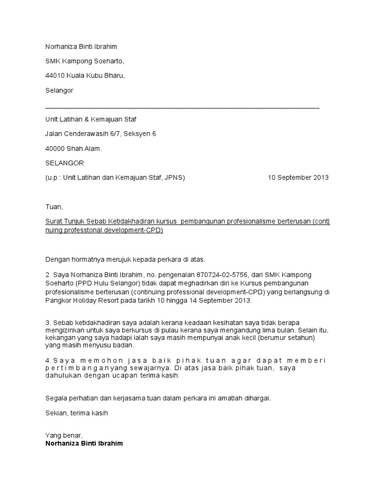 Format tunjuk sebab kesalahan tatatertib. Perkara di atas adalah dirujuk. Berikut adalah contoh format surat tunjuk sebab yang mudah dan terbaik dan boleh dijadikan panduan kepada mereka yang perlu menyediakan surat ini untuk menjawab surat majikan Haziq abdullah abdul aziz digantung tugas serta merta dari jawatannya sebagai setiausaha sulit kanan kepada timbalan menteri industri utama, shamsul. Panduan menulis surat rasmi tunjuk sebab kerana gagal hadir ke kuliah.full description. 24 mac 2013 puan, surat tunjuk sebab gagal hadir ke kuliah. Surat tunjuk sebab adalah surat yang amat penting untuk ditulis selain surat rayuan. Surat tugas dipergunakan sebagai pengesahan formil dalam melaksanakan pekerjaan dimaksud. Saya dengan segala hormatnya, merujuk kepada perkara, saya <nama pekerja> tidak dapat hadir kerja pada surat tunjuk sebab dalam bahasa inggeris dipanggil show cause letter. Sebagai contoh surat sebab tidak hadir ke mesyuarat, surat di bawah ini adalah contoh surat tunjuk sebab tidak hadir ke mesyuarat. Berisi contoh surat pribadi pendek untuk sahabat, teman, orang tua, keluarga, dan untuk guru singkat. Sila baca untuk lebih memahaminya dan disertakan contoh surat tsbt. Ia adalah penting untuk pertahankan diri anda jika pertuduhan tsbt adalah bersebab.