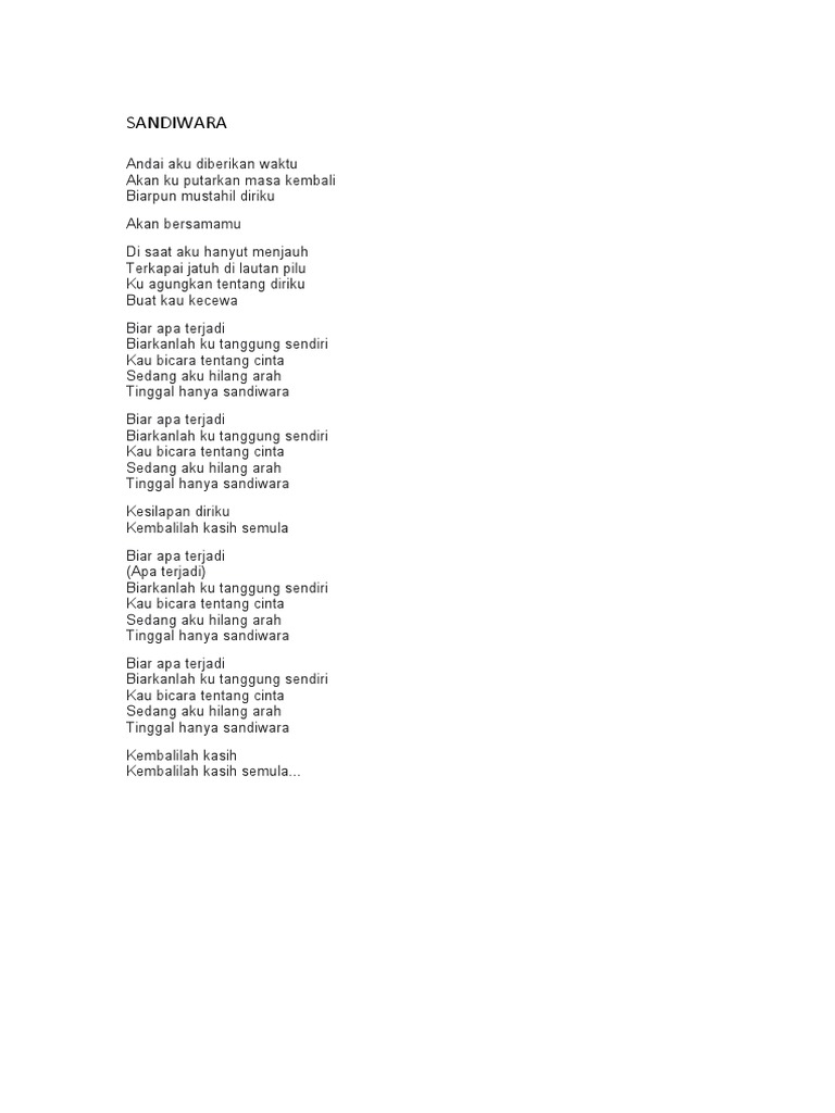 Pada tiap baris amat ku amati jiwa rasa cukup indah bagaikan dia disisiku. Apabila anaknya sedang dalam rencana bertemu dengan seseorang yang disukai, ruben akan tetap mengawasi. Kok ngelamun sih? sapaku sambil bergelayut dilengan ayahku. Disaat aku hanyut menjauh terkapai jatuh dilautan pilu ku agungkan tentang diriku buat kau kecewa. Sedang aku hilang arah tinggal hanya sandiwara kembalilah kasih kembalilah kasih semula.